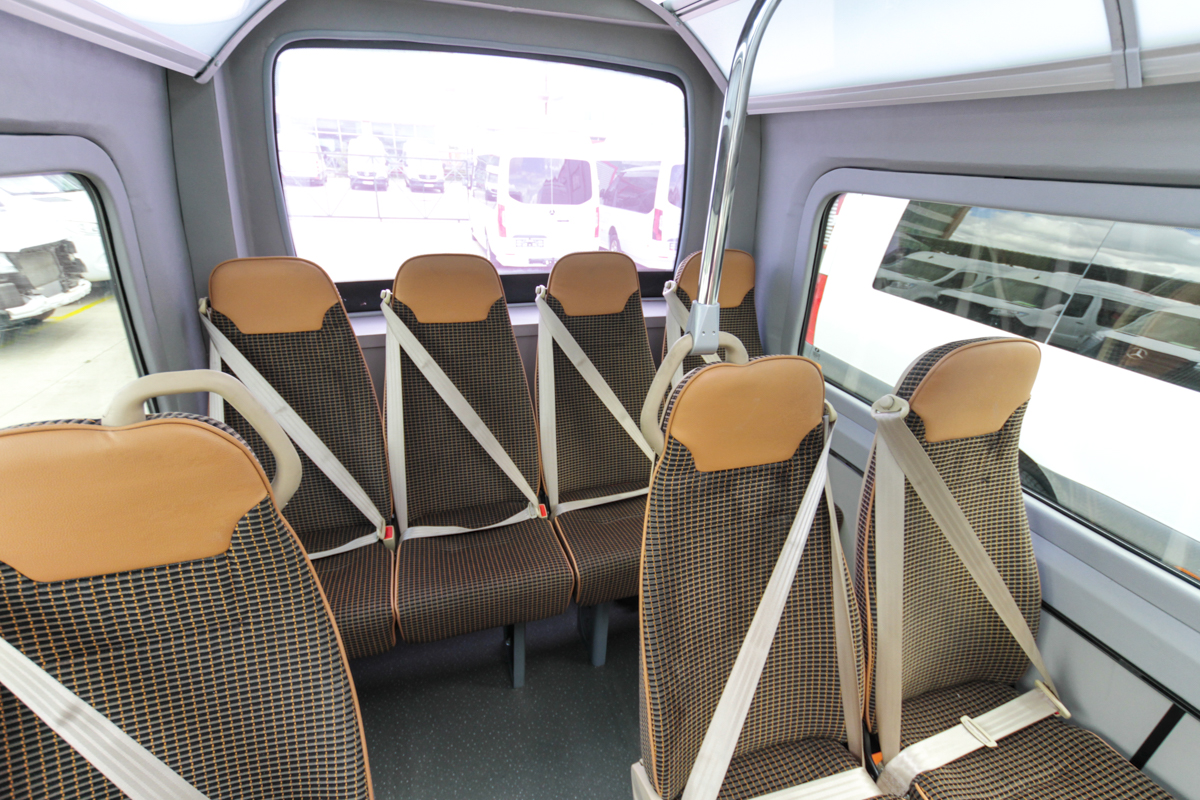 - 15 scaune + 2 strapontine (scaune pliabile), tapițerie din plus, centuri de siguranță în 3 puncte